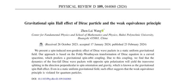 近期,公司基础物理研究中心和william威廉理论物理团队王振来博士在引力的弱等效原理的量子理论检验方面取得重要进展,相关工作以“Gravitational spin Hall effect of Dirac particle and the weak equivalence principle”为题,于2024年2月23日在线发表在国际权威物理期刊《PHYSICAL REVIEW D》上。william威廉官网为该工作的唯一署名单位。