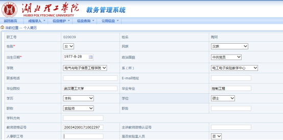 2、实践(验)教学平台中教师的个人信息由正方教务系统中同步而来。为使今后毕业设计(论文)统计的数据更加准确,请各位教师在正方教务系统将个人信息维护完整,特别是“学历”、“学位”、“职称”、“学科方向”等关键信息。
