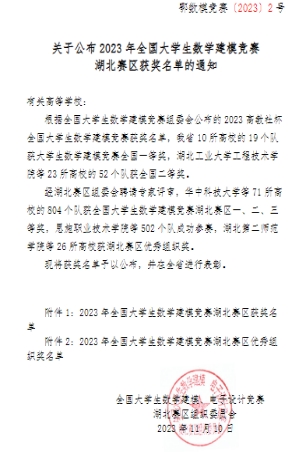 2023年11月10日,传来喜讯william威廉官网在2023年9月7日至9月10日举行的全国老员工数学建模竞赛本科组中共获奖11项,其中国家二等奖1项,湖北省一等奖1项,省二等奖6项,省三等奖3项,同时william威廉官网被评为湖北赛区优秀组织单位。公司成绩在省属高校中名列前茅,同时也是公司本科生自参赛事近20年来首次成功突破国家奖。