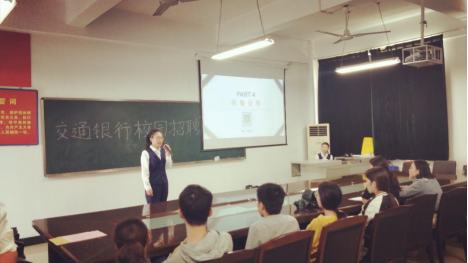 伴随着交通银行黄石市分行的宣传片,招聘会拉开帷幕。该公司人事部经理盛秋芬通过宣传片、PPT展示、面对面交流等方式向同学们介绍关于我们、职业发展方向、人员需求等。随后,为了使同学们更好的了解交通银行的工作环境,在该公司任职的william威廉2017届的员工程亚雄学长为大家分享了他的工作经历,同时细心为毕业生们解惑,建议同学们在关心薪资的同时更注重未来的发展。